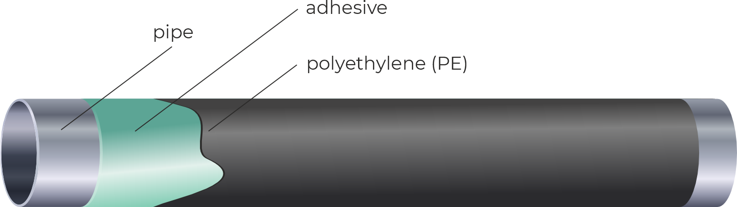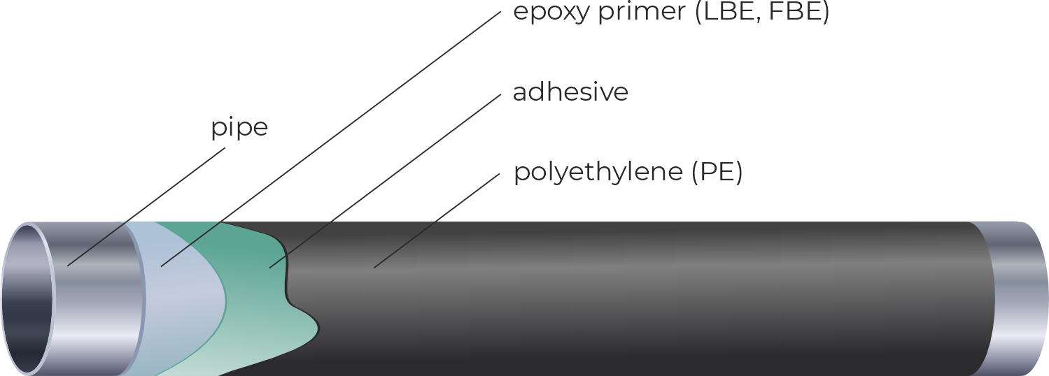 A 2-layer coating based on extruded polyethylene provides reliable and long-term (up to 50 years) corrosion protection for underground oil, gas and water pipelines in conditions of corrosive soils, soils with stray currents, etc.