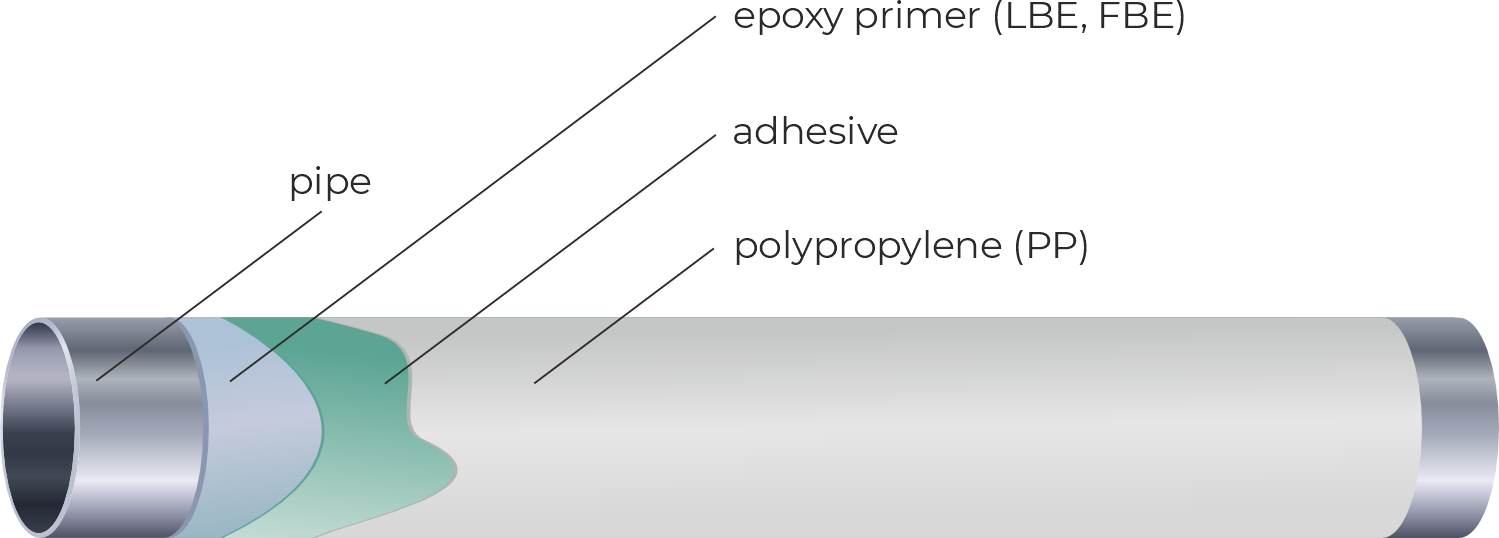 3-layer external anti-corrosion coating based on extruded polypropylene (3PP) is a highly reliable protective coating consisting of an epoxy primer layer, a polymer adhesive and a polypropylene layer.